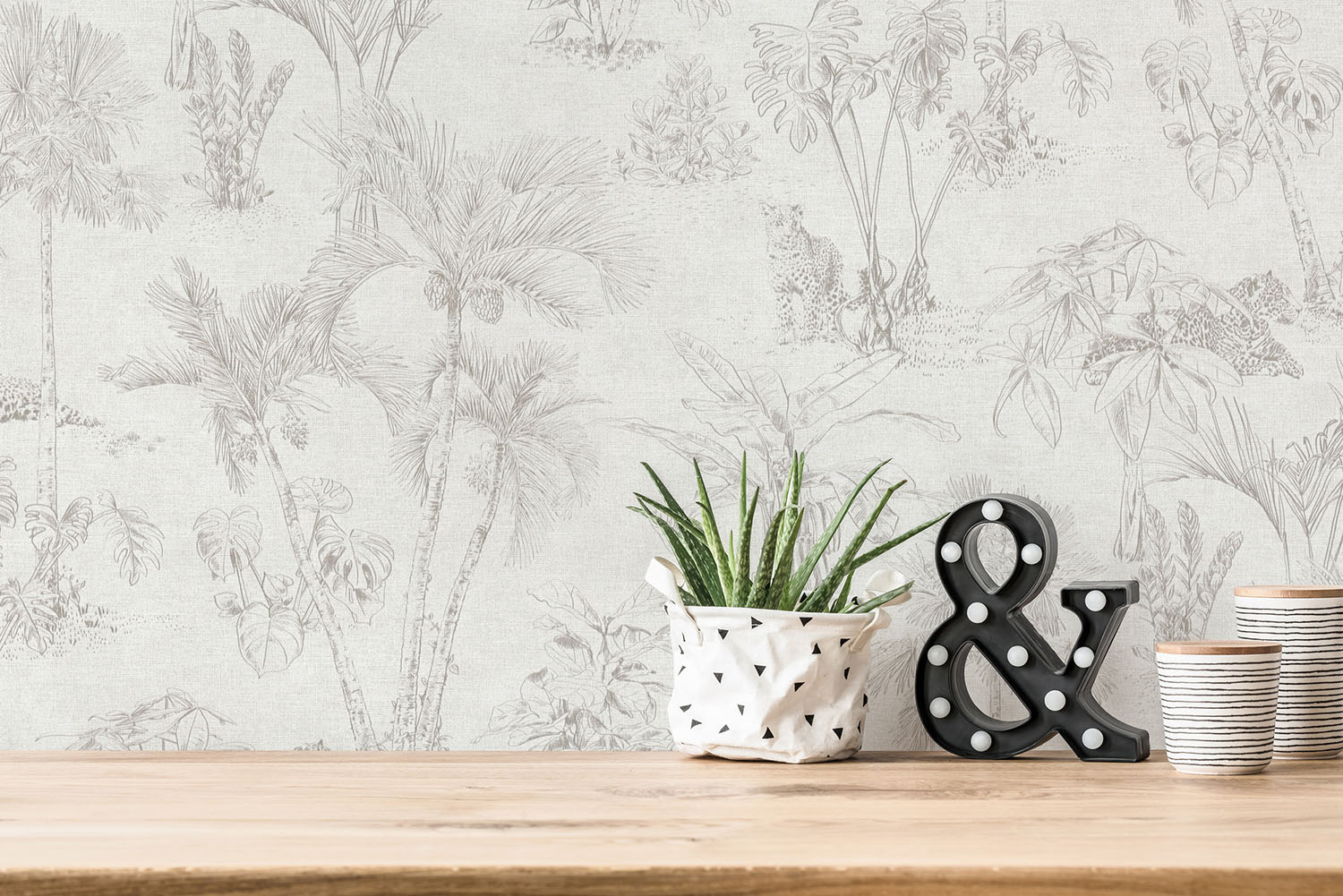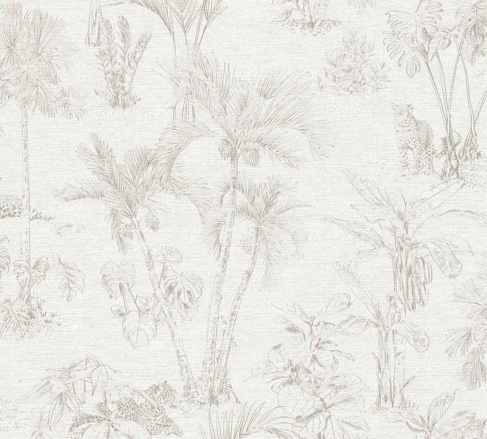 En härlig, vit/beige tapet med mönster av tropiska palmer och ståtliga leoparder. Denna non woven tapet är enkel att tapetsera då du rollar limmet direkt på väggen för att sedan fästa tapeten. Den har även en vinylyta, vilket innebär att den är avtorkningsbar.