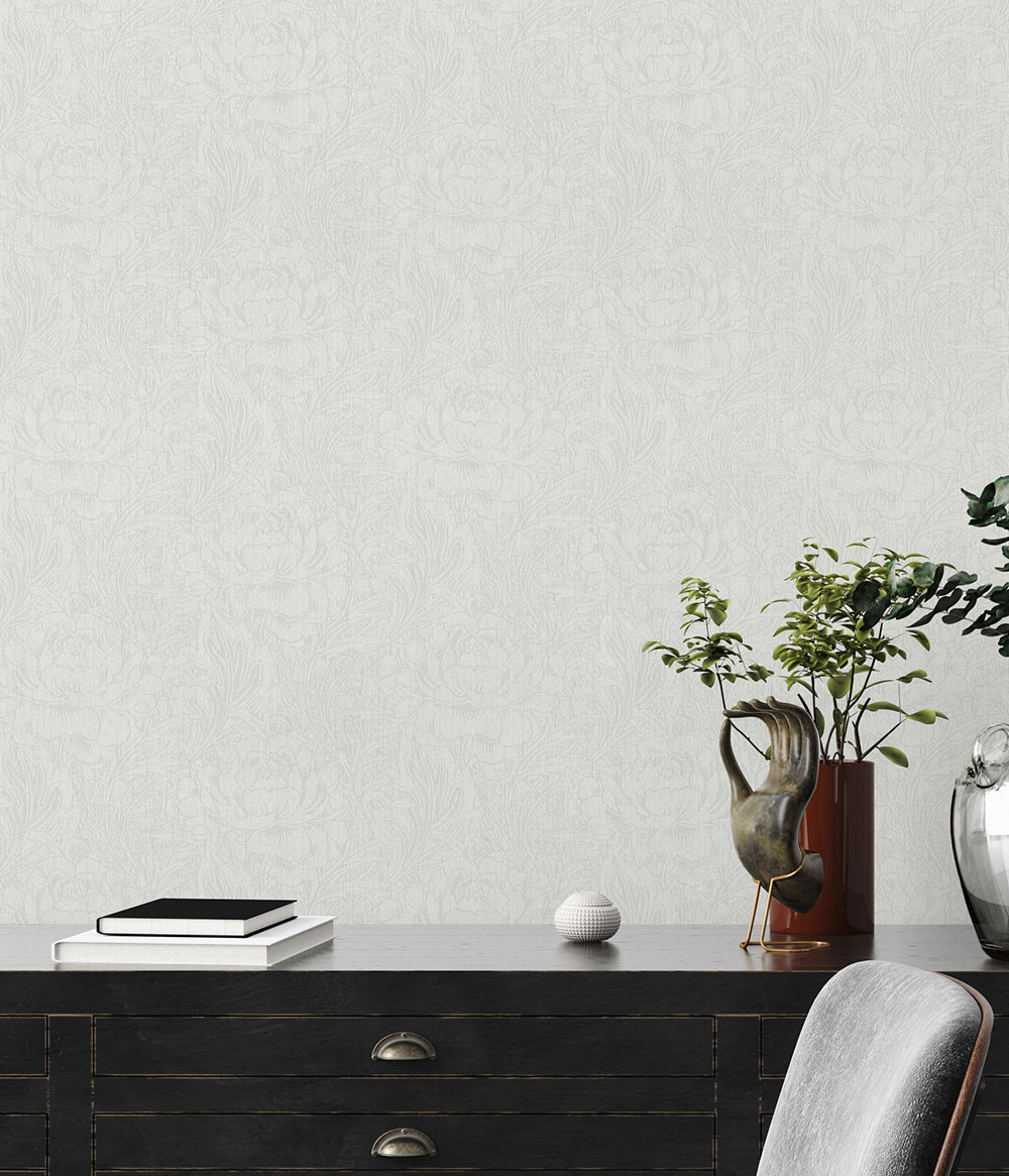 En lyxig vit/beige tapet med stora mönster av vackra blommor och blad som tillför det där lilla extra till rummet på ett stilrent sätt. Denna non woven tapet är enkel att tapetsera då du rollar limmet direkt på väggen för att sedan fästa tapeten. Den har även en vinylyta, vilket innebär att den är avtorkningsbar.