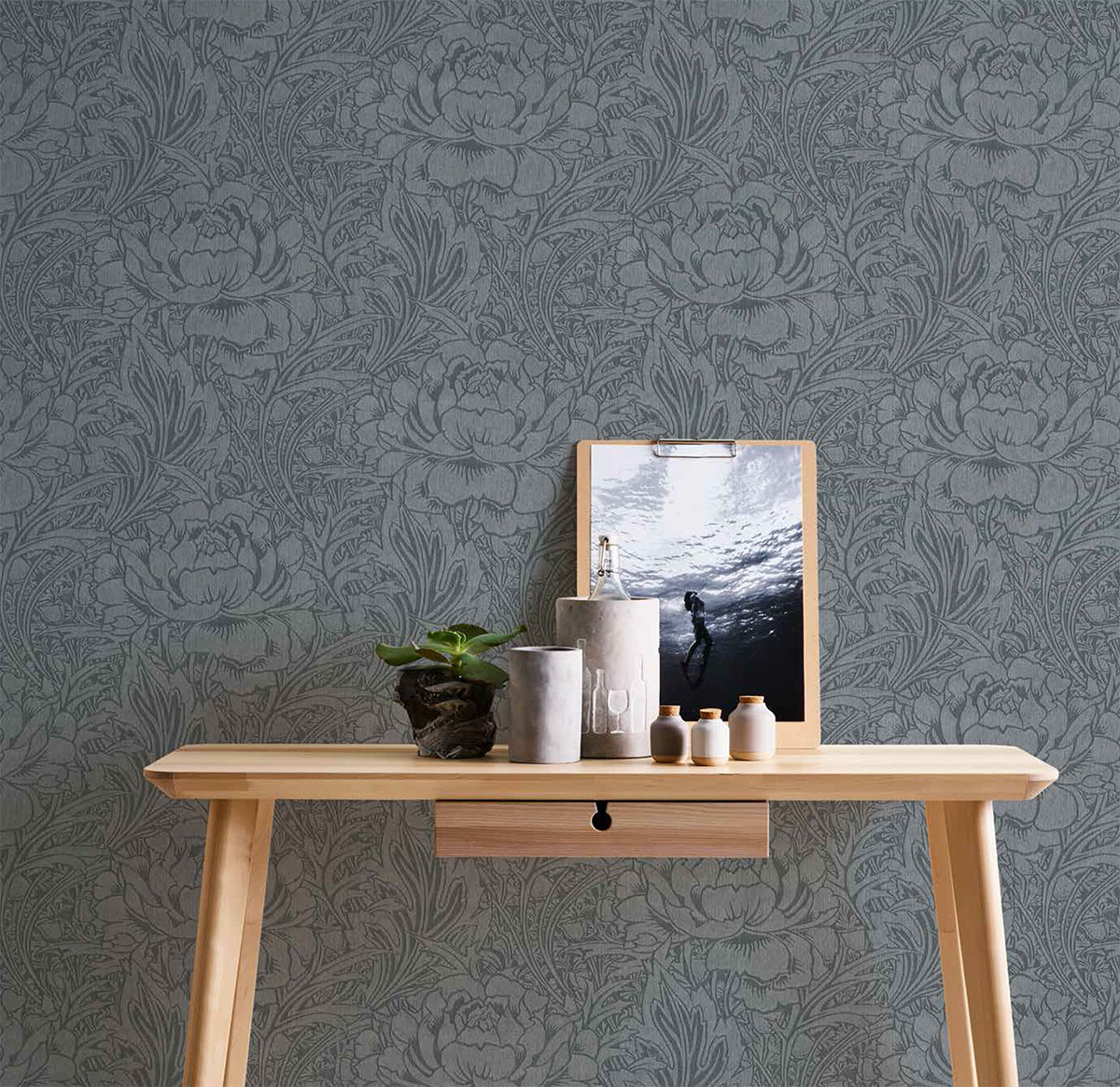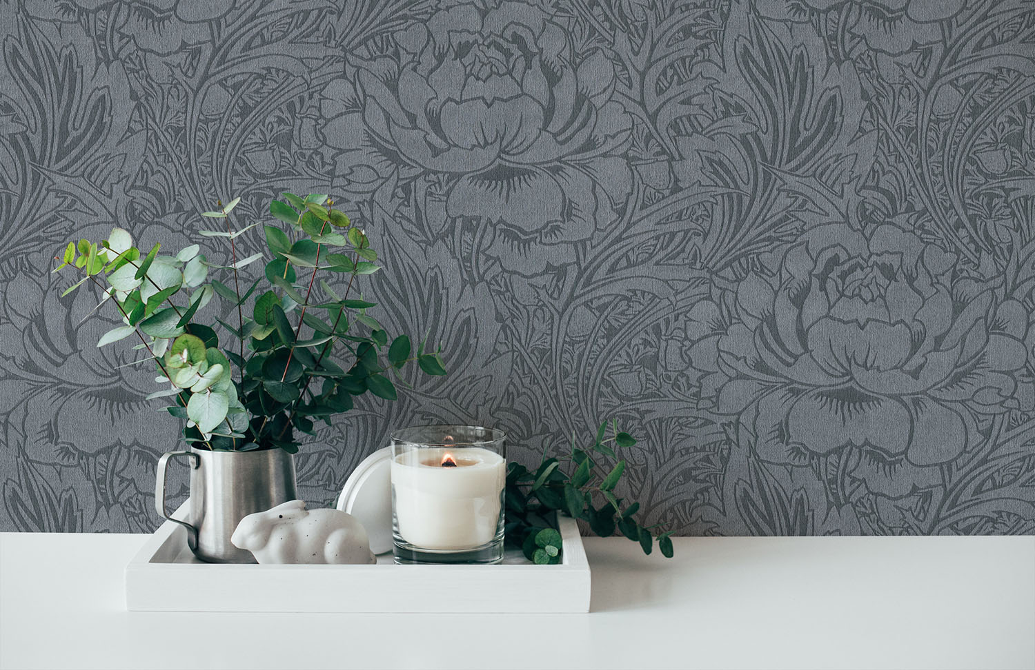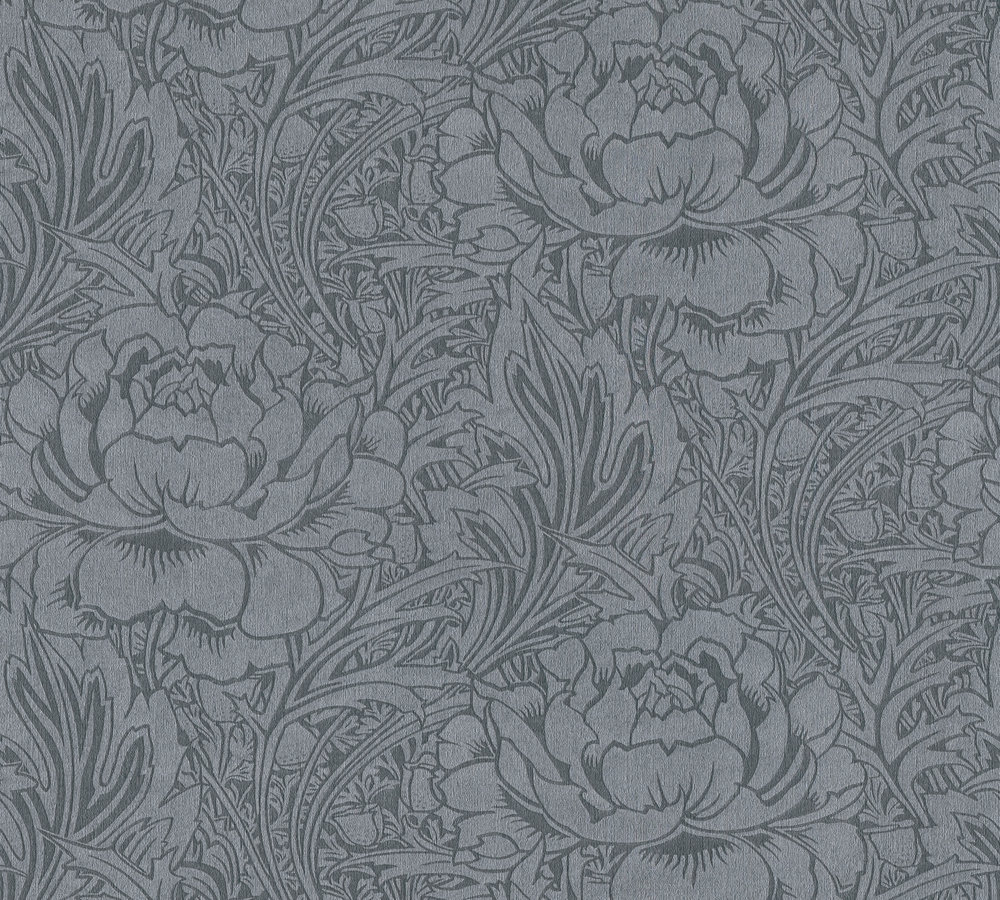 En lyxig grå tapet med stora mönster av vackra blommor och blad. Denna non woven tapet är enkel att tapetsera då du rollar limmet direkt på väggen för att sedan fästa tapeten. Den har även en vinylyta, vilket innebär att den är avtorkningsbar.