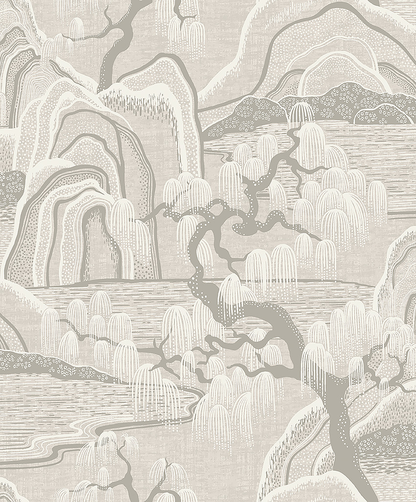 Ljusa, stormönstrade tapeten Indigo Garden pryds av ett sagolikt landskap med tydliga asiatiska influenser, signerat Noomi Spange. Linjer, prickar och mellanrum skapar rörelse och djup, en horisontell karaktär skänker ro och harmoni.En storstilad tapet som i denna ljusa, neutrala färgställning av grått, beige och vitt utgör en lugn, levande fond till övrig inredning. Extra fin i stora utrymmen, t.ex. vardagsrum eller öppen planlösning.