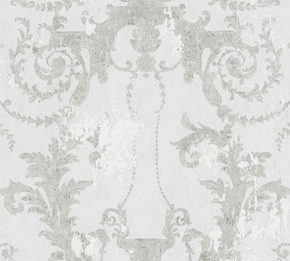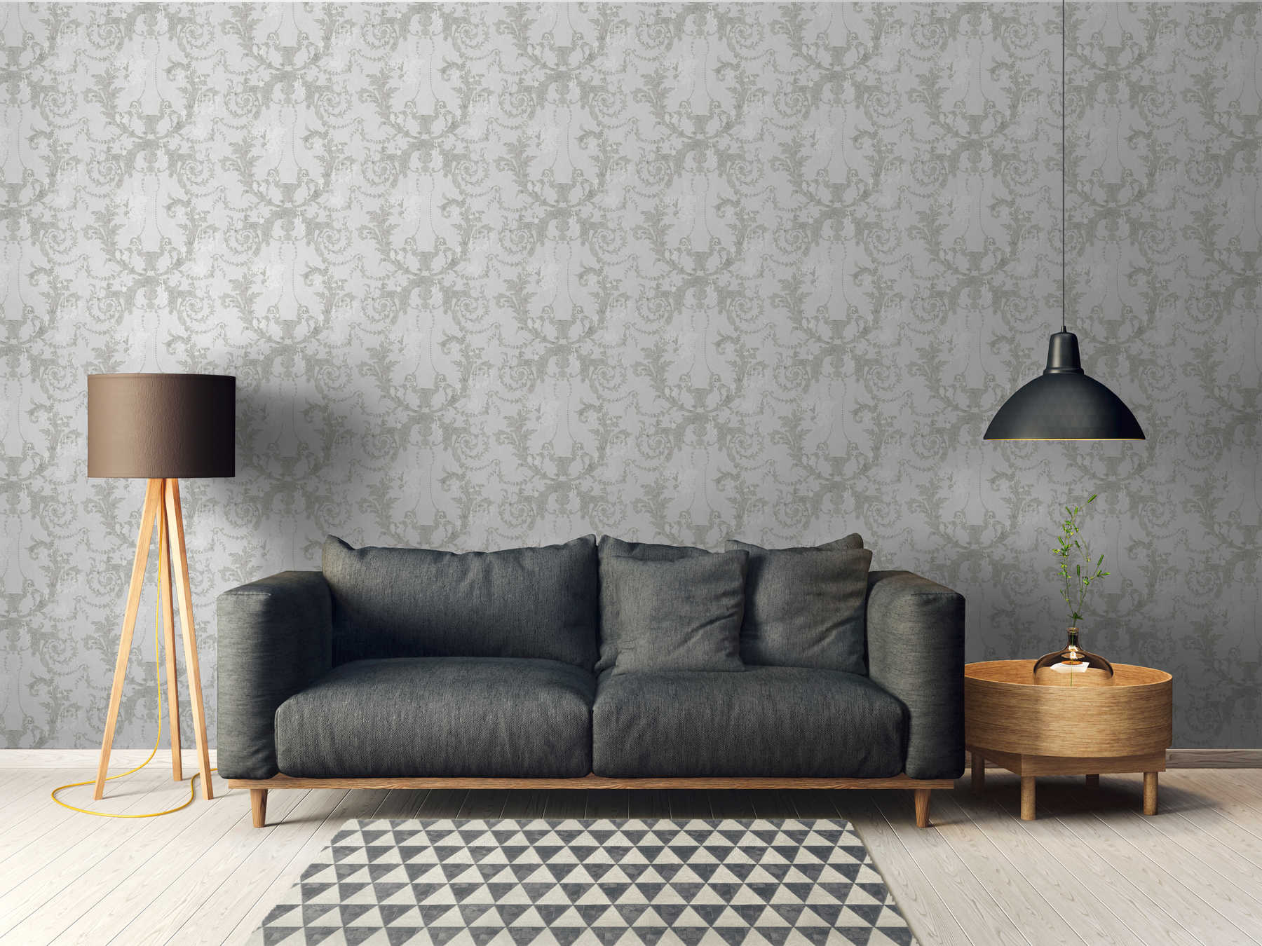 Ljusgrå strukturtapet med grå medaljong och silvrigt lyster. Ytan på tapeten är i vinyl som är ett tåligt material med hög avtorkningsbarhet.