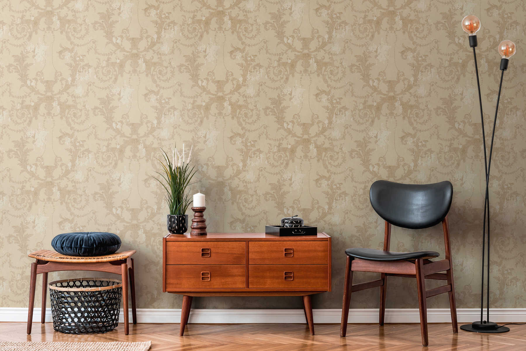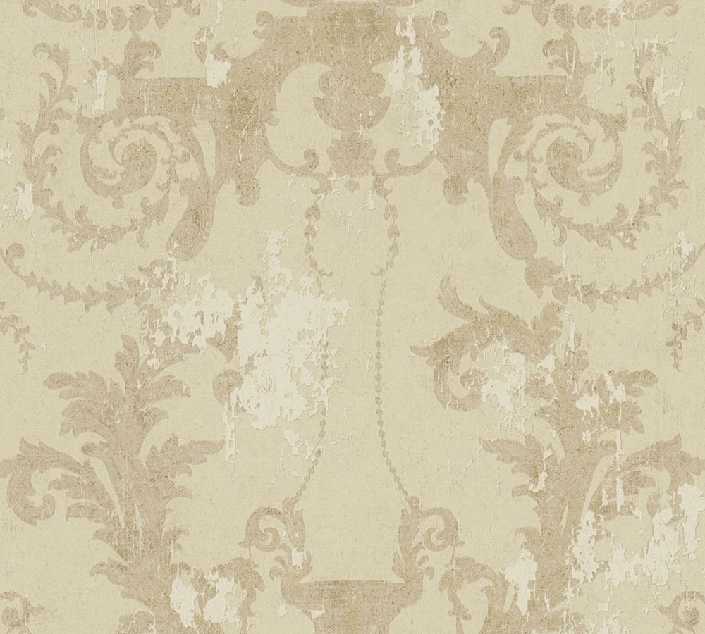 Beige strukturtapet med medaljong i guldigt lyster. Ytan på tapeten är i vinyl som är ett tåligt material med hög avtorkningsbarhet.