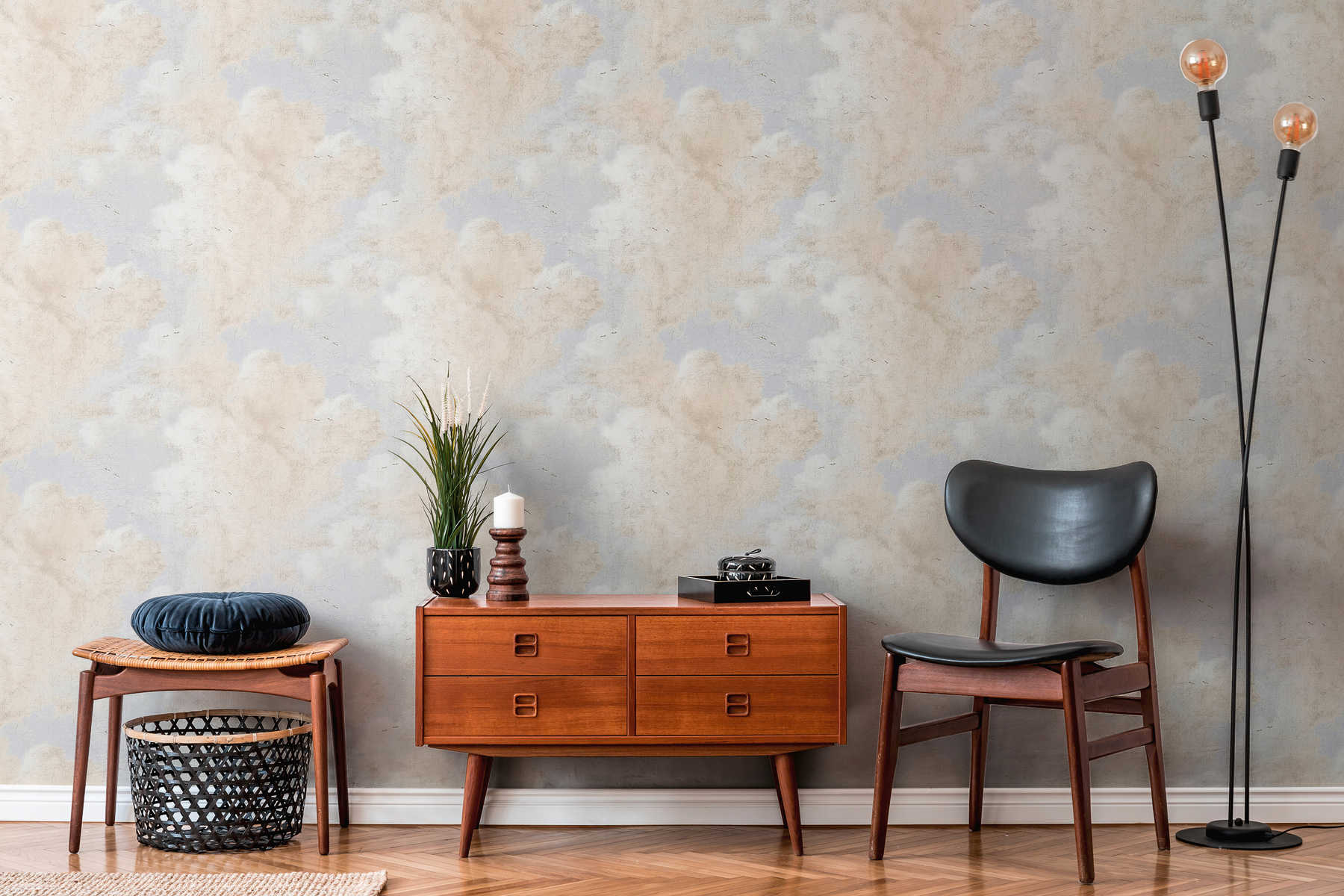 Tapet som föreställer grå/blå himmel och beiga/vita moln med sliten struktur. Ytan på tapeten är i vinyl som är ett tåligt material med hög avtorkningsbarhet.