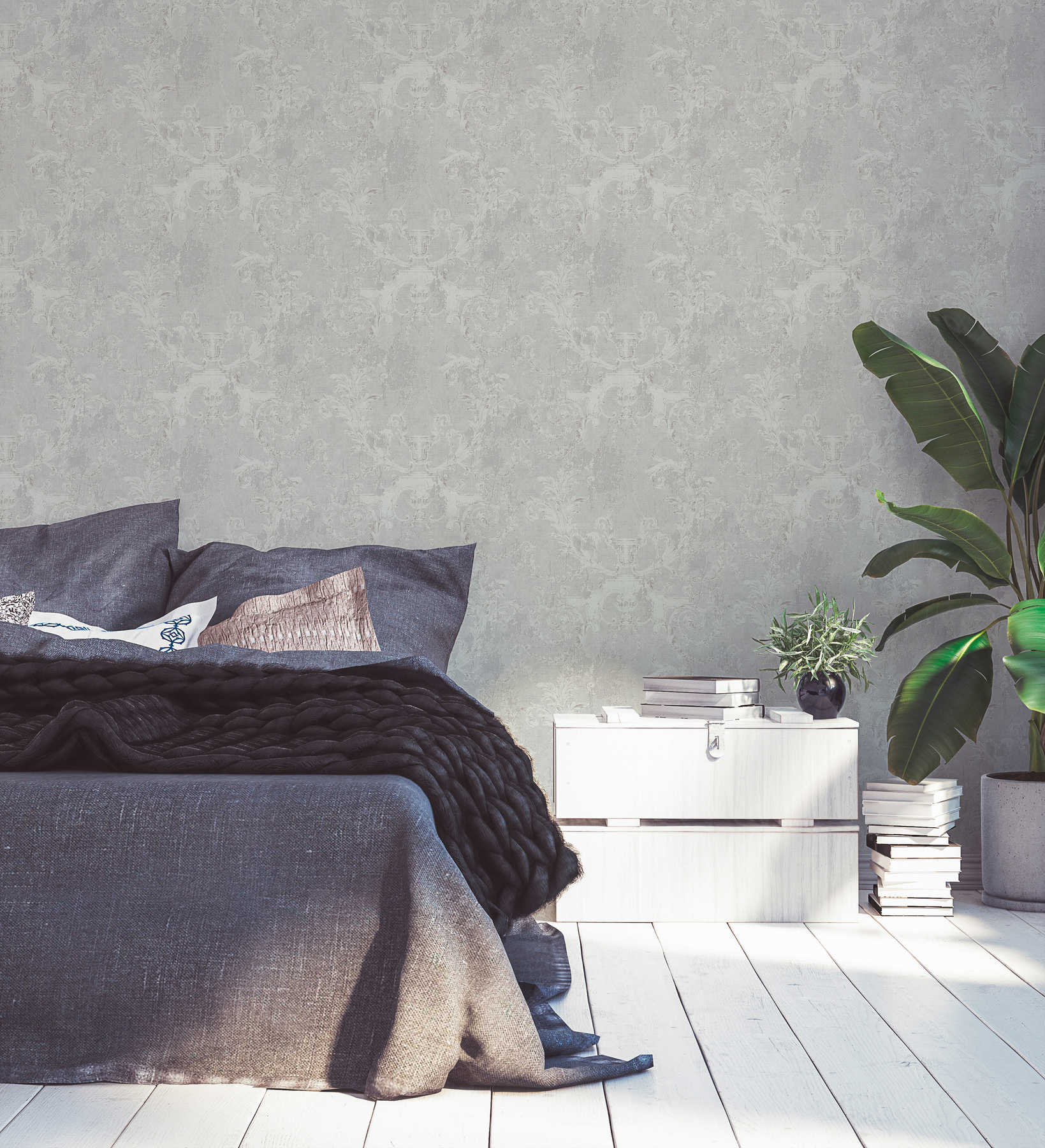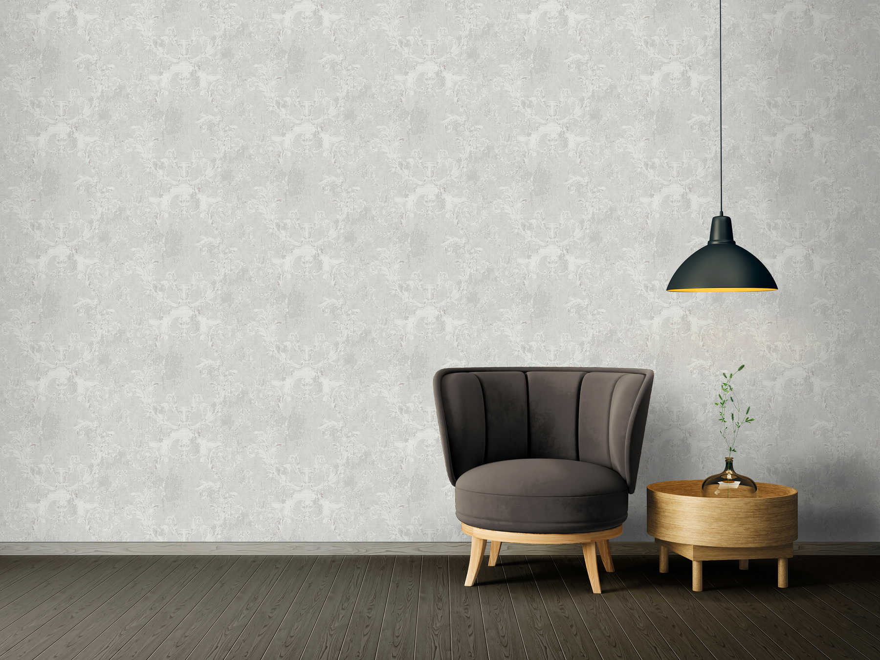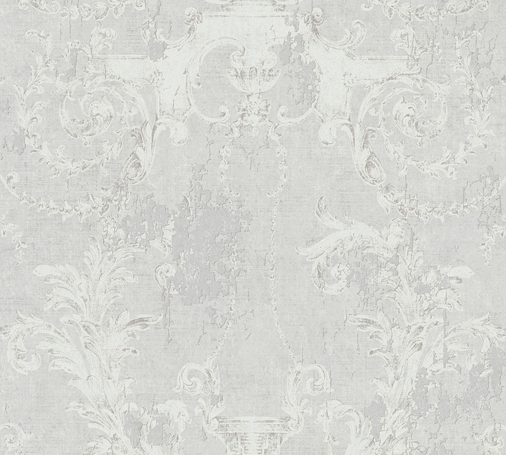 Ljusgrå strukturtapet med vita/grå medaljonger. Ytan på tapeten är i vinyl som är ett tåligt material med hög avtorkningsbarhet.