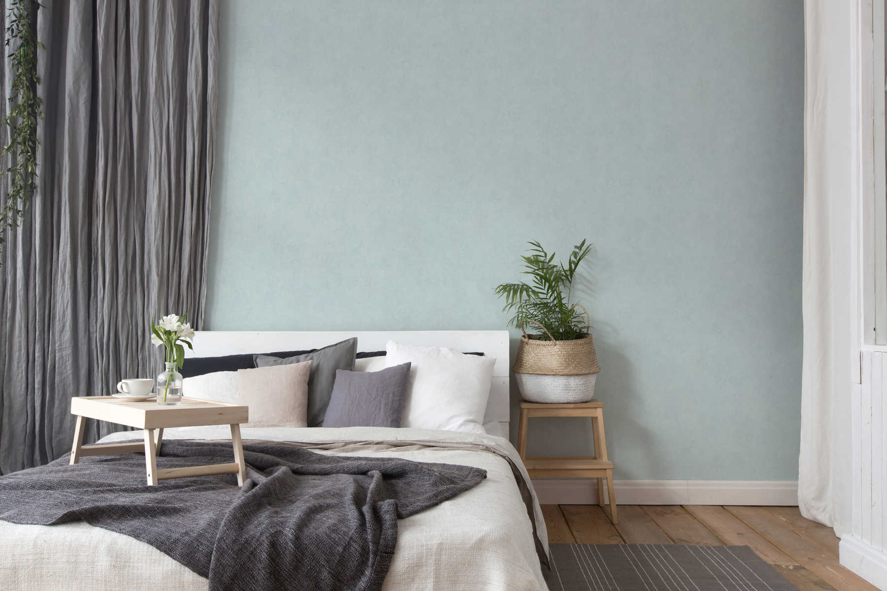 Tapet i mintgrön/blå nyanser med struktur och lyster. Ytan på tapeten är i vinyl som är ett tåligt material med hög avtorkningsbarhet.