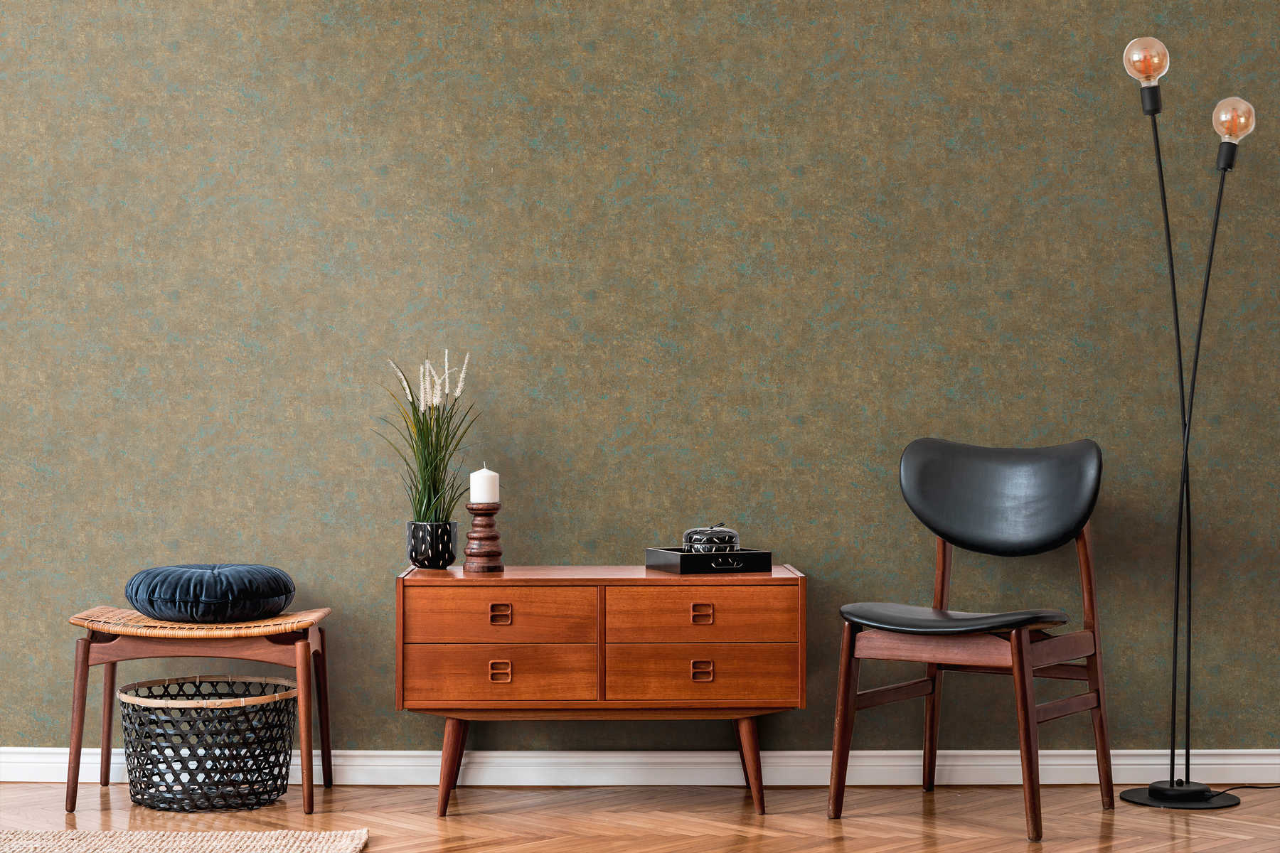 Strukturtapet i turkos och brun färg med struktur. Ytan på tapeten är i vinyl som är ett tåligt material med hög avtorkningsbarhet.