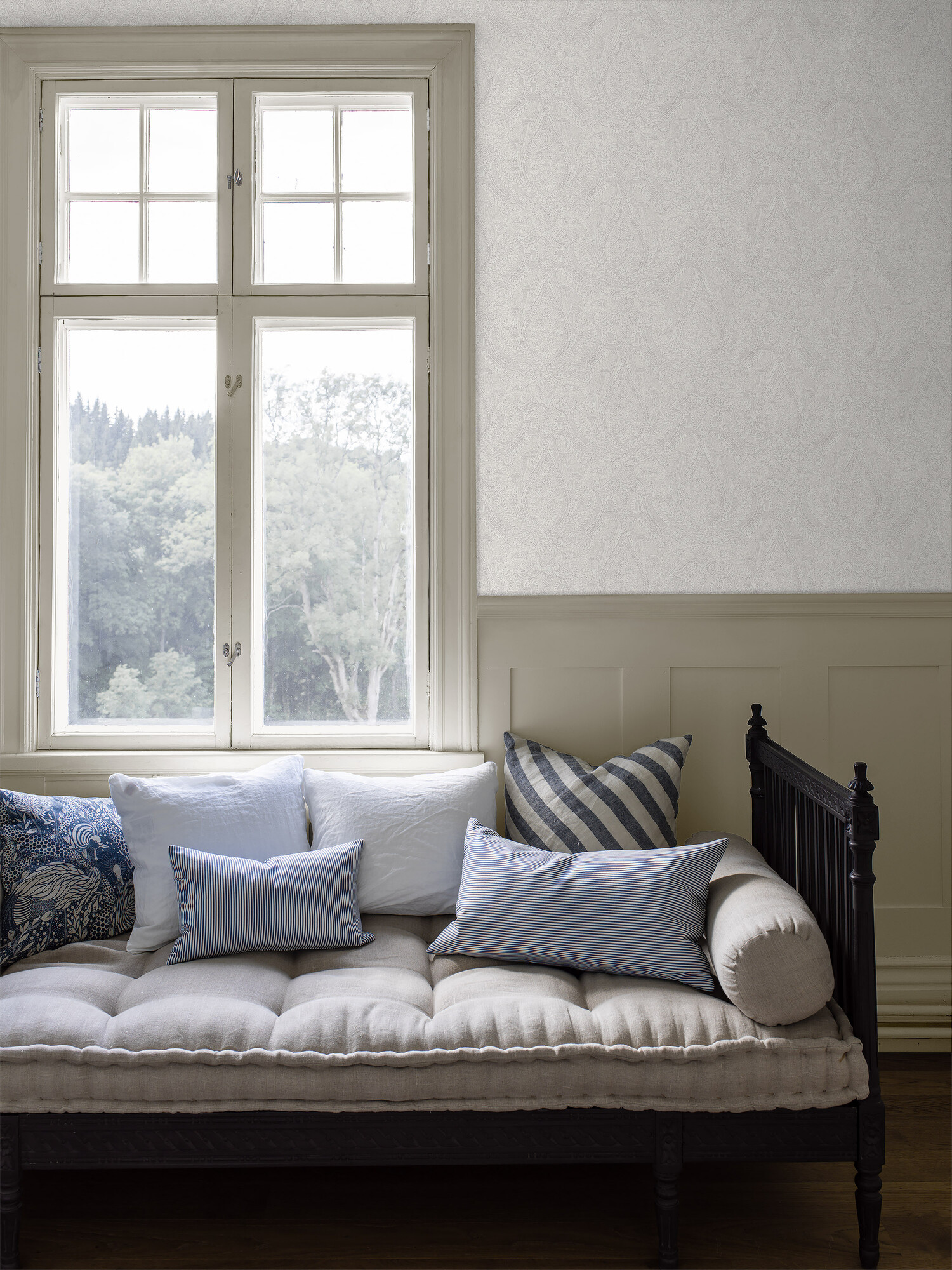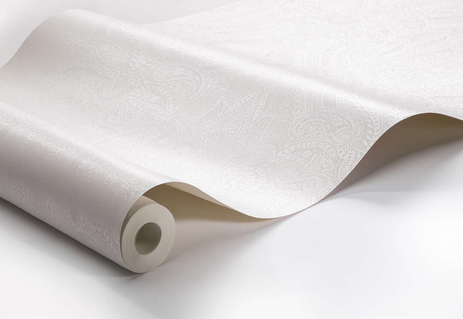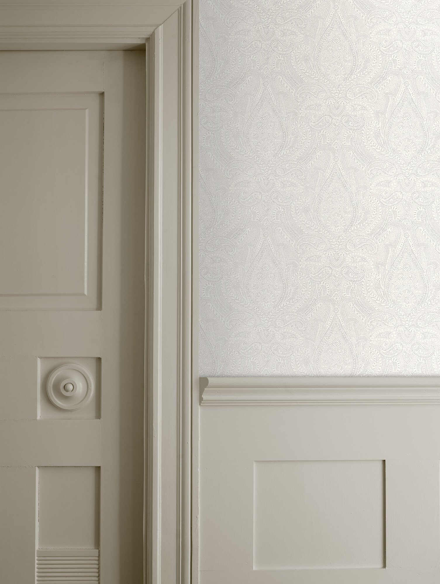 Divine Paisley är en vit tapet med klassiskt paisley-mönster och spännande kontraster mellan matta och skimrande ytor. Mönstret framträder olika mycket beroende på hur ljuset faller – en diskret men ändå uttrycksfull tapet som verkligen lyser upp rummet.